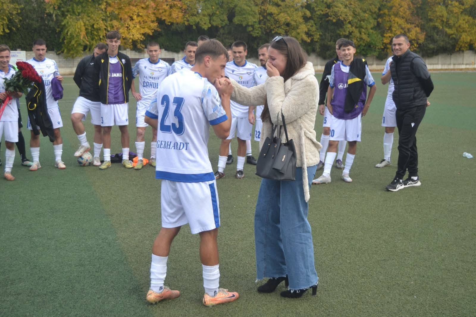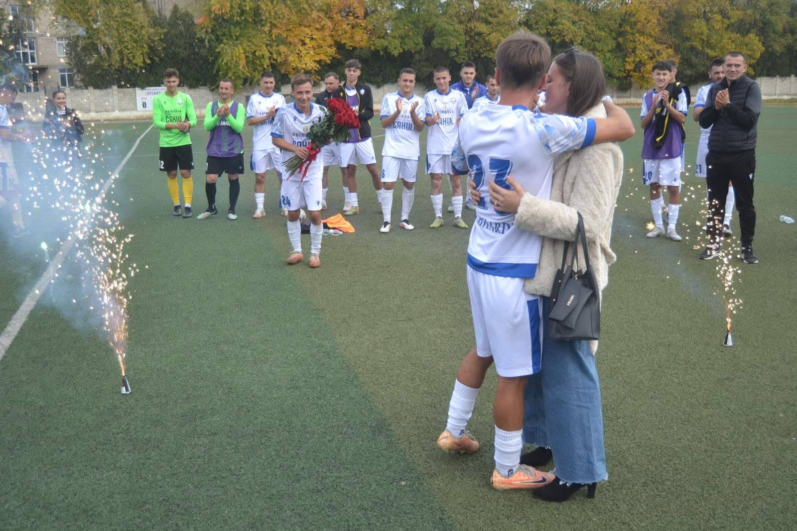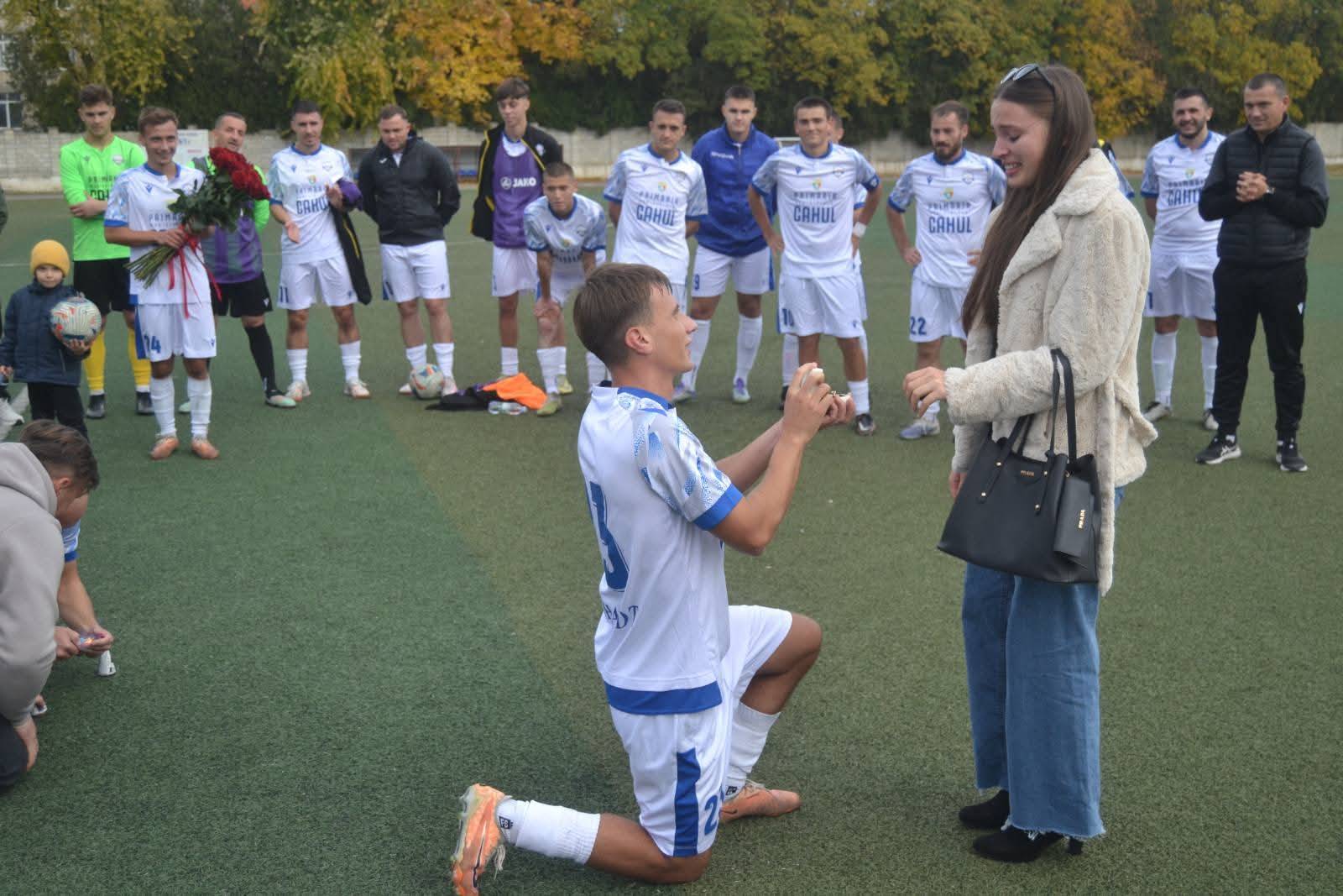 Înaintea fluierului de start, jucătorii Clubului Municipal de Fotbal Cahul l-au felicitat pe antrenorul principal, Vasile Mîță, cu ocazia nașterii fiicei sale, iar după meci, atmosfera s-a încărcat din nou de emoții — de data aceasta, de bucurie și iubire. Victor Ungureanu, jucător al echipei Clubului Municipal de Fotbal Cahul, i-a cerut mâna iubitei sale, Sorina.