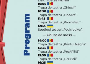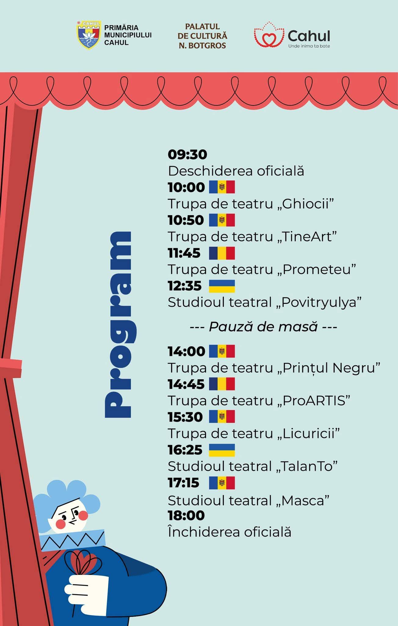Vă invităm să vizionați spectacolele prezentate în cadrul Festivalului Internațional „Primăvara Teatrală”, ediția a III-a, care va avea loc pe 3 aprilie 2026, în Sala Mare a Palatului de Cultură „N.Botgros” mun.Cahul, conform programului anexat.
